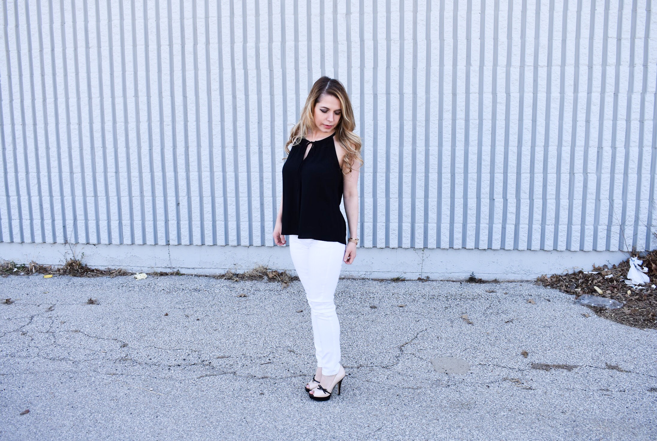 It’s no secret that I love monochrome style for myself and my littles. I’m even getting my husband on board. Some people think you can’t wear black and white for spring, but let’s be honest: those people are wrong. Today, I’m sharing one of my favorite monochrome looks for spring: white denim paired with a black halter top.