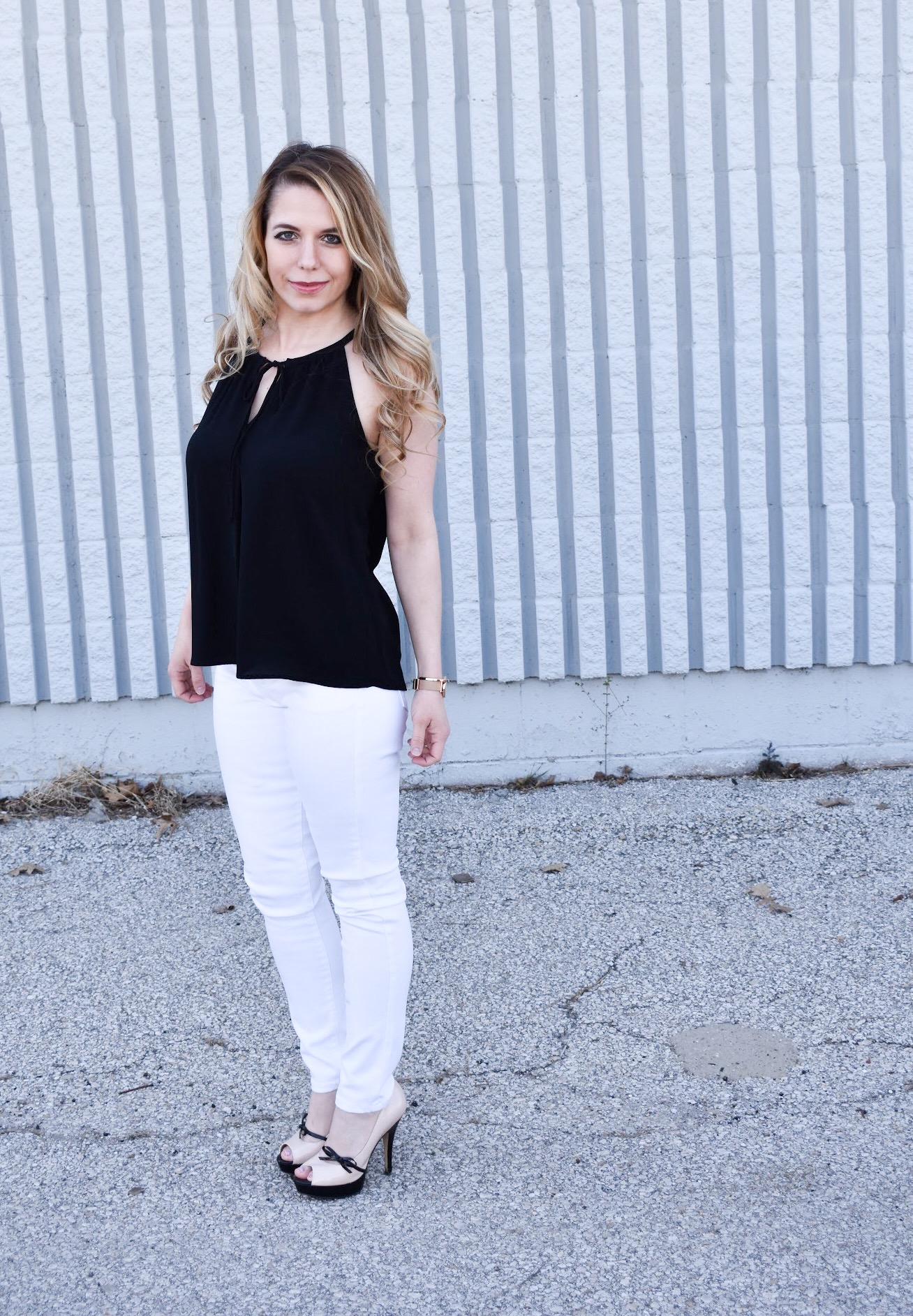 Stain-Resistant White Skinny Jeans // Black Halter Top // Nude + Black Peep Toe Platforms // Rose Gold Watch // Coordinating Rose Gold Cuff Bracelet