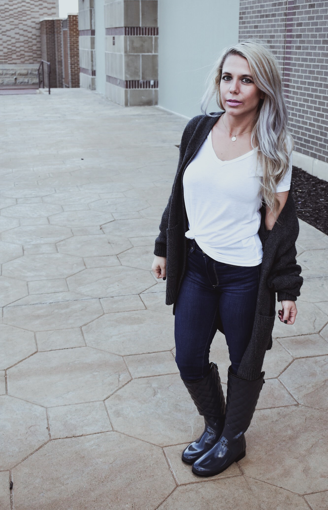 Shop this Look: Cardigan // Layering Tee // Skinny Jeans // Hunter Boots on sale // Initial Pendant
